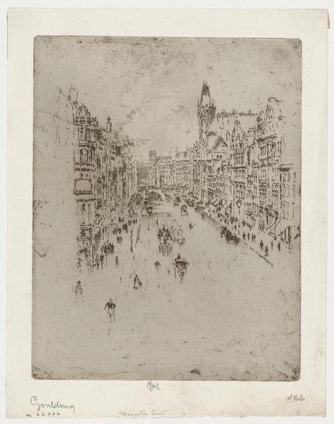 Joseph Pennell created this etching, titled "The Griffin," during an era captivated by urban modernity. Pennell, an American expatriate, was deeply influenced by the Aesthetic movement, which valued beauty and art for its own sake, and his works often depicted cityscapes with a sense of romanticism. Here, the griffin monument is framed by the city's architecture. The griffin, a mythological creature, becomes a symbol of power and mystery amidst the bustling urban landscape. The print captures a moment in time, reflecting the rapid changes and industrial advancements that shaped the era. "The Griffin" encourages us to consider the relationship between mythology, urban development, and the human experience. It’s a glimpse into a world where ancient symbols and modern life converge, inviting us to reflect on how we reconcile the past with the present.