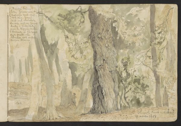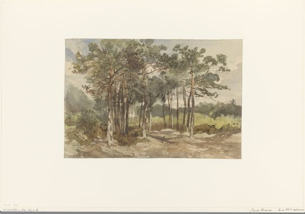 Curator: Edward Lear, most well-known for his nonsense poetry, was also a prolific landscape artist. Here we have "The Cedars of Lebanon," a watercolor and ink drawing from 1858, now residing at the Art Institute of Chicago. Editor: Whoa, instantly serene. Those ancient cedars feel almost like benevolent giants, watching over everything. There’s a quiet grandeur to the scene. Curator: The work fits neatly into the tradition of Orientalism that was popular at the time. Lear traveled extensively in the Near East, and he aimed to capture the "authenticity" of these locations in his art, of course always through his own cultural lens. Editor: I find it fascinating how the landscape feels both realistic and slightly dreamlike. Like a memory. You can almost feel the dry air and smell the resin of the cedars. It's very evocative, despite its muted palette. What kind of statement do you think he was hoping to make? Curator: It's difficult to definitively state Lear's intention, but cedar trees, particularly the Cedars of Lebanon, held symbolic significance. They represent longevity, strength, and even immortality—culturally loaded icons for European audiences at the time. His plein-air style reflects a desire to record the 'real,' but inevitably imbued with romantic sentiment. The use of watercolor captures fleeting effects of light and atmosphere... Editor: Right! Like those two figures in the foreground that become dwarfed by these enormous beings, that for me says so much. It reminds me that every moment we experience is simultaneously epic and unbelievably tiny. I feel so centered just looking at it, I feel like those ancient trees are telling me that whatever's stressing me right now will pass. That my moment, is well, just a moment. Curator: Indeed, that contrast is very striking. Lear leverages both his draftsmanship and emotional register to create a profound meditation on nature, culture, and the self. These historical contexts shape not only how we appreciate art but, for the museum, how we engage with its evolving meaning. Editor: Exactly. Art becomes this kind of connective tissue, where history brushes up against our immediate felt experience. Curator: Absolutely. This drawing reminds us to observe closely, think critically, and feel deeply. Editor: Well said! Now, I'm going to go hug a tree, but probably something a little more local!