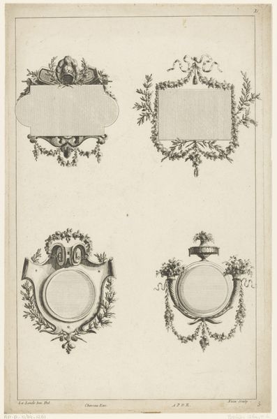 Curator: Welcome. Before us, we have a graphic work entitled "Drie ovale cartouches," created between 1726 and 1734, its maker unfortunately lost to history and cataloged as anonymous. The piece utilizes engraving on what appears to be laid paper. Editor: Right, I get an immediate sense of playful elegance from this. It's like a blueprint for a party that never happened! So formal, yet the curving, almost whimsical lines keep it light. The baroque style is shouting, quietly. Curator: Indeed. The Baroque ornamentation is central to understanding its composition. Observe the emphasis on dynamism and the rather exuberant detailing. The engraving manifests as meticulously rendered acanthus leaves, shell-like volutes, and elaborate scrollwork, each contributing to a layered effect. Editor: What strikes me is the negative space inside the ovals, it’s tantalizing! Like vacant windows awaiting portraits of eccentric relatives, maybe? These empty forms make the surrounding busyness seem even more elaborate. What’s your take on the forms? Curator: The very essence of a cartouche lies in its functionality. It is, at its core, a frame – a space designated to hold text, imagery, a coat of arms, what have you. The interplay of line, texture, and form work to invite a kind of engagement with what is meant to fill this void. Editor: Well, I'm engaged. But more like my brain wants to grab some collage material, scissors and see what *I* would frame with it, you know? It feels like an invitation for anyone to come play in this gorgeous design. Even now. It's strange, isn't it, that something so carefully structured gives me permission to scribble. Curator: Precisely. I'd agree it invites not merely observation but speculation—prompting us to consider how the aesthetic function operates and shapes meaning itself, or even anticipates future use and forms. Editor: I suppose, beyond Baroque splendor, it hints that even empty frames can still hold untold potential for stories yet to come. What’s more wonderful than that?