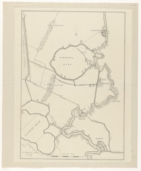 Curator: Immediately, I am struck by the stark contrasts within this etching. The deliberate strokes, the precision, the clarity of line. It is visually very well organised. Editor: It’s almost clinical, wouldn't you say? Something about the deliberate arrangement speaks to a deep preoccupation with controlling and mapping the world, especially during a period rife with social and political conflict. Curator: Indeed. This piece, titled "Kaart van het Graafschap Holland en Utrecht," plate 33, was created in 1639 by Jacob Aertsz. Colom. It is a fascinating example of Dutch Golden Age cartography, rendered in pen, etching and print. The lines articulate land as much as they contain it, delineating what can be controlled. Editor: I'd push further, arguing this map isn't simply a representation of geographical space. Look at how these delineations become boundaries of power. Each mark reinscribes hierarchies, privileges of access, who and what belongs in the imagined national project, or in the more localized "Graafschap." Curator: It's an interesting claim; however, its strength is equally evident in the geometrical precision and clean line-work, its inherent form speaking to order and clarity. Notice how each deliberate line adheres to geometric principles; that this document operates as a record is more crucial than its theoretical dimensions. Editor: But even the aesthetic decisions aren’t neutral. It privileges legibility. The choice to foreground names over geographic details is more than efficient documentation. To whom, then, does this document communicate and for what intention? What kind of citizen can understand this map? The effect creates knowledge and power, don’t you agree? Curator: Of course, and let us not lose sight of Colom's skillful management of form. The layout displays a mastery of linear perspective to offer depth on a flat plane, thus presenting reality by way of considered artifice. Editor: Which circles back to that very active verb, “presenting.” So many ideological presuppositions are baked in that word! The power is not simply what it depicts but in the very act of mapping. Curator: On closer inspection, both function and inherent construction speak to how intention may become manifested on paper with incredible power. Editor: An artwork that unveils our embeddedness within layers of authority…a sobering reflection in pen, ink, and paper.