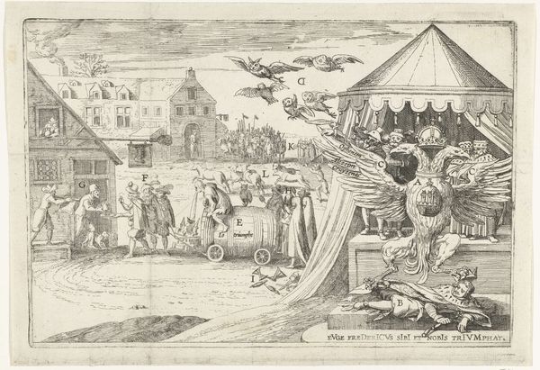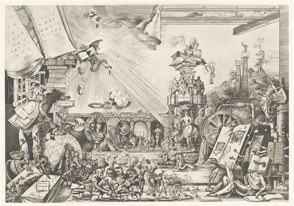 Curator: What a dramatic piece! It gives me the chills just looking at it; the mood is quite haunting, the black ink makes this vision feel ancient and ethereal. Editor: Indeed! Here we have Cornelis van Dalen I's "Mannen en vrouwen kijken in de geopende graftombes van historische personen," an engraving from around 1655, housed here at the Rijksmuseum. It presents such a fascinating exploration into the performance of class and gender during the Baroque Era. Curator: The labor involved in producing these engravings must have been enormous! It makes one consider the socioeconomic dimensions of the workshops during this time, and the artistic contributions made by marginalized labourers in comparison with affluent male patrons. What a process of carefully planned gestures the piece exposes! Editor: Precisely! There's a tension here between mortality and status, the living gaze upon these opened tombs, it evokes themes of historical narrative. In their costumes, do you also see those anxieties and tensions between societal position, the reality of our mortality, and also perhaps a longing to participate in some greater historical or theological drama? Curator: I do! I believe those figures are trapped in a hierarchical power system that normalizes class division. Those are embedded values that the wealthy are both attracted to and terrified of as it concerns death. Editor: And think of the Baroque's own engagement with history, a kind of aesthetic obsession! Here, van Dalen uses the scene as a moral lesson, highlighting the universality of death. Curator: This indeed leaves us in a somber tone...it urges us to understand our material reality and consider the narratives told by and about it in times of social transformation. It forces us to evaluate our contribution to a world that, at times, feels quite bleak. Editor: Absolutely! The work stands as a potent symbol of Baroque reflection. An examination of social hierarchies and mortality told by labour and material reality.