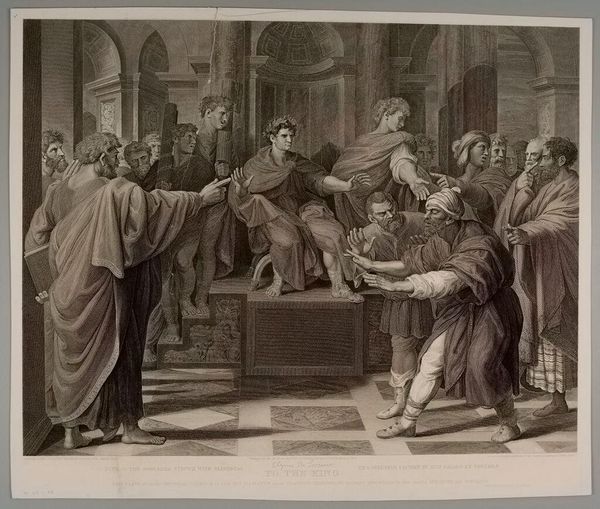 Curator: This is Carlo Rampoldi's "Christ Disputing with the Doctors." Rampoldi, born in 1775, captures the biblical scene of a young Jesus in the temple. Editor: My immediate impression is one of hushed tension, everyone is leaning in. It feels theatrical, staged almost, like a serious play unfolding. Curator: Absolutely, it's a very deliberate composition. Rampoldi is working within a tradition of religious art that emphasizes clarity and dramatic effect. The setting, the postures... it all suggests a pivotal moment. Editor: That kid is radiating a powerful certainty that the old guys are clearly not so certain about! Curator: Religious art served a very specific function. It instructed, it inspired, and it reinforced certain social hierarchies, even in the way knowledge is presented. Editor: Knowledge is power, even for a kid. Curator: Seeing it through that lens makes me appreciate how images like these were carefully deployed. Editor: And I get a sense of the eternal battle between youthful zeal and the weight of tradition, a dance we're still doing.