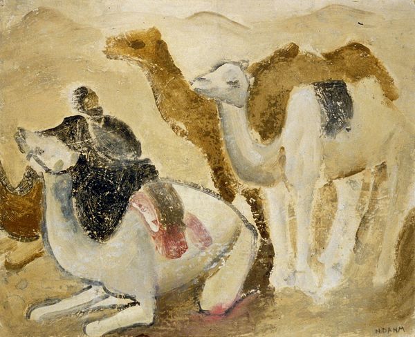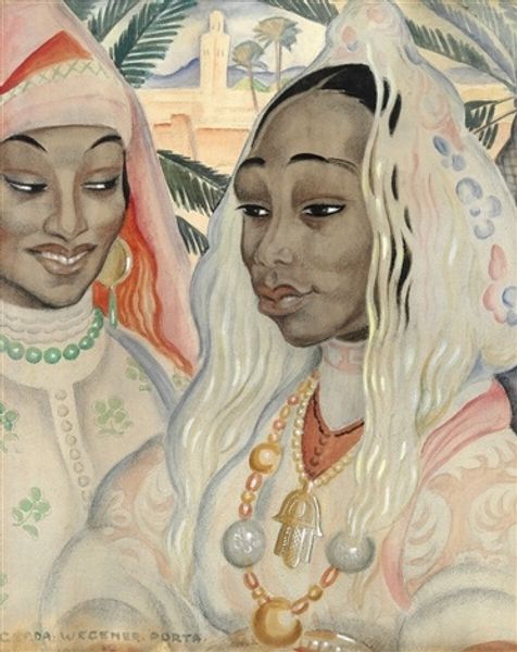 Curator: Gerda Wegener's "Moroccan Newlyweds (Aicha and Djialli)," painted in 1934. The medium used seems to be watercolor, giving it a delicate yet vibrant quality. Editor: It strikes me as both romantic and a little melancholic, almost like a still from an old film. The pastel tones and soft light really capture a particular mood. Curator: Wegener was a Danish artist working during the Art Deco period, and she travelled extensively. What can we glean about artistic exchange when European artists adopt and, let's be frank, market aesthetics from different cultures? Editor: That's the key question, isn't it? This work falls into the Orientalist tradition. We have to consider the power dynamics inherent in representing another culture through a European lens, and how this contributes to larger historical narratives and prejudices. This particular style gained traction partly because institutions, critics, and audiences back home readily consumed and legitimized the view of exotic, foreign lands. Curator: Agreed, but I also look at the very act of creation: watercolor itself, the pigments chosen. Were they locally sourced materials during her time in Morocco? The layering suggests a deliberate, meticulous process of applying colour, building up depth, considering both her experience and material conditions of her making art. This makes us also reflect on the position and role of the artist in that society, what would her impact have been? Editor: Absolutely. The reception of the painting in its time—and even today—hinges on understanding its socio-political context. It's important to consider whether its display, in any setting, reinforces stereotypes, exoticizes other cultures, or fosters genuine cross-cultural dialogue. This, to me, makes a difference on the way it gets appraised. Curator: For me, thinking about the supplies, Wegener’s studio, the journey these objects take really brings the moment and place to life. And the subtle blending of color reminds that a deep exploration of materiality in art expands our comprehension. Editor: Ultimately, looking at Wegener's work reminds us that art is never created in a vacuum. By investigating both the image and context it provides insight into art history itself.