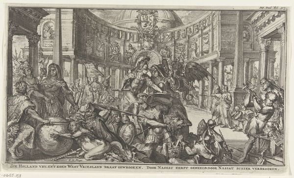 Editor: Here we have Bernard Picart's "The Bridegrooms of the Law," an engraving from around 1725, currently residing at the Rijksmuseum. There's so much happening. It's a bit chaotic but feels…ritualistic? What do you see in this piece? Curator: Indeed! This engraving is a fascinating visual document of cultural memory. It reflects not just an event but a ritual, pregnant with symbolism. Consider the central figures, surrounded by a crowd. Are they figures of celebration or ridicule? Editor: Hmm, there's something… ambiguous about it. The torches feel aggressive, yet the window onlookers seem amused, not alarmed. What does the title, "The Bridegrooms of the Law," suggest in this context? Curator: Excellent question! It speaks volumes. The ‘Law’ here isn't civic or divine law but hints at social norms, the expectations around marriage and community behavior. Are these 'bridegrooms' embracing or being forced into a union with these expectations? Look at their stance. Is it defiance or acceptance? This juxtaposition is loaded with psychological tension, questioning the nature of conformity. What elements tell you if this conformity is welcomed or imposed? Editor: The pulling and pushing dynamic! Some are pulling ropes tied to the figures, forcing them forward. The duality makes it compelling—are they willing participants, or are they being paraded against their will? Curator: Precisely! And this duality is the very point. Picart captures a moment where individual desire clashes with societal expectations. The symbolic 'marriage to the law' then becomes a potent visual metaphor for social control. So, is this cultural memory a celebratory or cautionary tale? Editor: I hadn’t considered the element of control until you pointed it out. I initially focused on the surface chaos, but now I see the deeper, psychological conflict at play. Thank you. Curator: My pleasure. Visual symbols reveal so much, offering continuous, multifaceted perspectives, changing our interpretation across time.