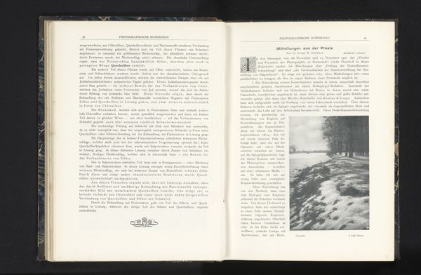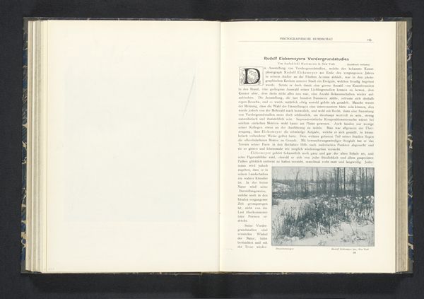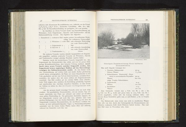 Editor: This is "Gezicht op een aantal bomen langs een pad," or "View of some trees along a path," created before 1902, presumably a gelatin-silver print within a publication. There's a melancholic beauty to it; the bare trees almost seem to weep over the still water. How do you interpret this work? Curator: It's interesting how that melancholy is conveyed through the symbol of the weeping willow, often associated with mourning and loss across cultures. In visual terms, observe how the artist uses the reflection in the water to create a doubling effect, intensifying the somber mood and amplifying the cultural memory attached to these natural symbols. Are you familiar with how trees function as symbolic "axis mundi" in many traditions? Editor: I've come across it, yes – trees connecting different realms. I hadn't really connected that to photography before, though. Curator: Photography, like other forms of image-making, has always borrowed from and contributed to this vocabulary. Notice the deliberate choice of a monochrome palette and the almost stark composition which further strips away any vibrancy and leaves us with a starker representation of mourning. In the Western canon, photographic landscapes often reflect both scientific observation and deep personal feelings. Do you see any tension or confluence of those themes in the picture? Editor: Yes, the focus on capturing a specific location has the scientific aim, but the final image is definitely charged with the artist's emotions. So it is both about the 'what' and the 'how', which is more enduring and potent for the audience. Curator: Precisely. Photography uses science, but the emotional weight lies in its evocative potential, ensuring cultural continuity across time. Editor: Thanks, I'm really looking at this landscape in a new light. Curator: It’s all about exploring what memories lie rooted beneath the surface.