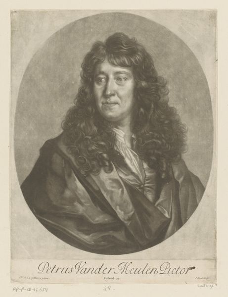 Curator: Let’s turn our attention to "Portret van een onbekende man met pruik, mogelijk een schilder," an etching and engraving print of anonymous authorship, dating somewhere between 1677 and 1721. Quite the find, isn’t it? Editor: Indeed! My immediate impression is one of slight discomfort, a restrained disquiet. The tonal range is subdued, but the subject’s intense gaze and that... voluminous wig… create a somewhat unsettling presence. Curator: I think you’re responding to the sheer artifice of the Baroque portrait. The wig itself speaks volumes about social display and status. Consider the labour involved in its production, the materials sourced, the economic systems that made such elaborate self-presentation possible! This wasn’t just about vanity; it was a highly regulated performance of identity. Editor: Yes, but let's focus on the more formal elements for a moment. Look at how the artist has rendered the textures – the smooth planes of the face against the wiry, almost chaotic, curls of the wig. And that collar, slightly askew, drawing our attention to the vulnerability of the neck beneath. It's a study in contrasts, and perhaps that's the source of the unease you mentioned. Curator: It's definitely the power dynamics on display. This isn’t merely observation; it's a manufactured persona, crafted within very specific social and economic parameters. Even the print medium, allowing for wider distribution, highlights the performative aspect of identity in the period. Whose image was being circulated, and why? What class of artisans and patrons were at work? Editor: The use of light and shadow adds another layer. Notice how the face is illuminated, almost spotlighted, drawing focus to expression. Curator: An expression deliberately cultivated, I'd argue, by forces far beyond the individual depicted. But yes, that highlights the deliberate way it draws attention. Editor: So, it seems both process and material help highlight and enforce those powers. Curator: Precisely! A simple glance turns out to reveal volumes about the means of representation and production. Editor: A valuable lesson indeed, now I see how those concepts tie in to a formal study!