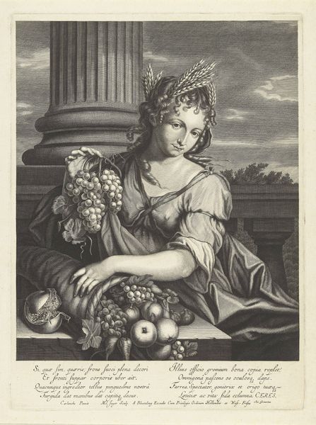 Francesco Bartolozzi created this stipple engraving, "Flora", sometime between 1728 and 1815. The monochrome print depicts a woman adorned as Flora, the Roman goddess of flowers and spring. Note how the composition uses a gentle tonal range to create soft gradations of light and shadow. Bartolozzi’s stipple technique lends a delicate, almost dreamlike quality to the figure. Observe how he uses line and form to guide the viewer's eye from the elaborate hairstyle, down the flowing lines of the gown, to the classical column and floral arrangements. The figure's relaxed pose and serene expression add to the overall sense of harmony. This work reflects the 18th-century interest in classical antiquity and the allegorical representation of abstract concepts. The artist’s technique, combined with the subject matter, invites us to consider the relationship between classical ideals and contemporary artistic practices. It also makes us think about the changing meanings associated with images of women in art.