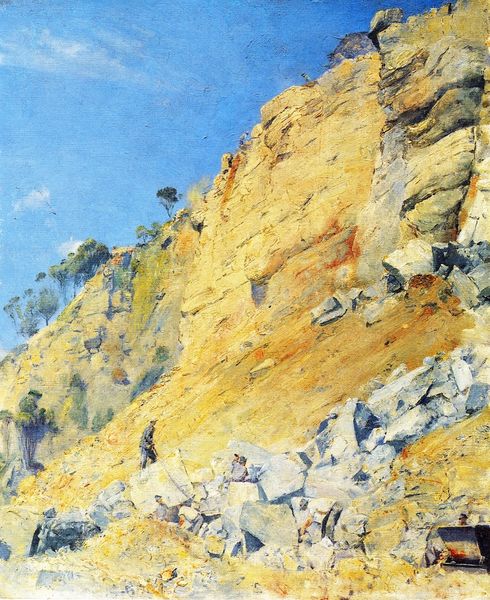 Editor: Arnold Böcklin’s oil painting "Pan Frightening A Shepherd," made in 1865, certainly conveys a sense of chaotic movement! The poor shepherd is covering his ears as goats scatter down a rocky slope. And is that Pan himself lurking above? What do you see in this piece? Curator: I see Böcklin tapping into the anxieties of his era, anxieties linked to industrialization and the perceived loss of connection with nature. Here, the figure of Pan, a pagan god of the wild, isn't just a mythological character; he becomes a symbol of the untamed forces threatening the modern, ordered world. Böcklin painted this during a time of massive upheaval, so what could the shepherd represent in contrast to the looming figure of Pan? Editor: Perhaps the shepherd symbolizes a kind of innocence or vulnerability, exposed to the raw power of nature? Curator: Exactly. And Böcklin's deliberate choice to depict this scene through a Romantic lens is crucial. Romanticism in art and literature often championed the sublime and the irrational, qualities suppressed by Enlightenment values. Böcklin positions nature as dangerous and even violent, contrasting the era’s rationalization efforts to control nature, or worse, claim that the "wild" must be tamed or eliminated. This is less a scene of bucolic pastoral life and more a confrontation between civilization and its suppressed primal instincts. It suggests that, perhaps, we have misunderstood our own place in a complex ecosystem. What do you make of that bright ball near the Shepherd? Editor: Interesting point... Is that an orange he dropped, now a symbol of disrupted idyllic life? It's almost mocking the shepherd's fear! I never thought of Romanticism in this critical light. Curator: These artists' visual statements opened dialogue and shaped public perceptions. Considering the political and environmental issues in art of the current moment, Böcklin's statement still echoes. Editor: I’ll certainly never look at Böcklin the same way. Thanks for pointing out the socio-political context!