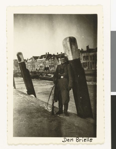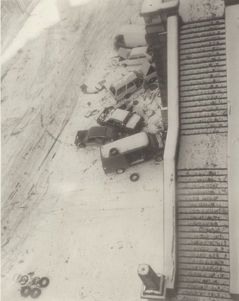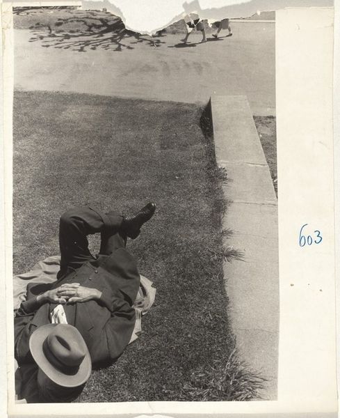 This small gelatin silver print captures an overhead view of men conversing on a street, and its anonymous maker reminds me that artmaking is about what you see, and how you decide to frame it. The composition is striking, almost like a stage set, with the figures arranged in a dynamic yet frozen tableau. One man gestures, maybe explaining something, while another lies prone on the ground, creating an interesting tension. Look at the surface texture – the graininess of the silver gelatin, the way light catches the concrete, rendering everything in shades of grey and brown. This isn’t about slick perfection; it's about the raw, unfiltered reality of a moment. There's a strange intimacy in this candid shot, like peeking into a private world. It reminds me that art doesn't always need a famous name or a grand statement. Sometimes, it's the simple act of bearing witness that makes it meaningful. Like the work of Lisette Model, it embraces the everyday, transforming ordinary scenes into something compelling and mysterious.