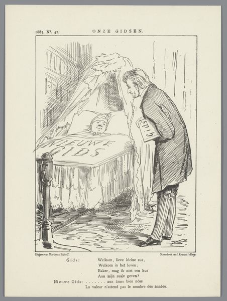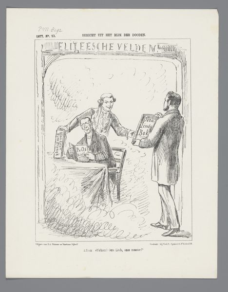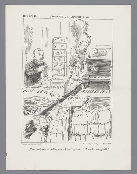 Johan Michaël Schmidt Crans created this print, sometime in the late 1870s, as a commentary on Dutch financial policy. It reflects a period of significant economic and political change in the Netherlands. The cartoon depicts a man displaying a bag labeled 'Batice Sloten', suggesting closed or failed ventures. This imagery speaks to themes of economic uncertainty and failed promises. The inscription translates to: ‘My lords there is nothing left in it; it is all at the bottom of the barrel… to the new loan’ Crans invites us to consider questions of accountability and governance. He compels us to reflect on whose voices and experiences are often marginalized or ignored in representations of national identity and progress. Ultimately, this print serves as a reminder of the complex relationship between economic policy, societal well-being, and political representation. It leaves us to reflect on the emotional and personal dimensions of financial and political decisions.