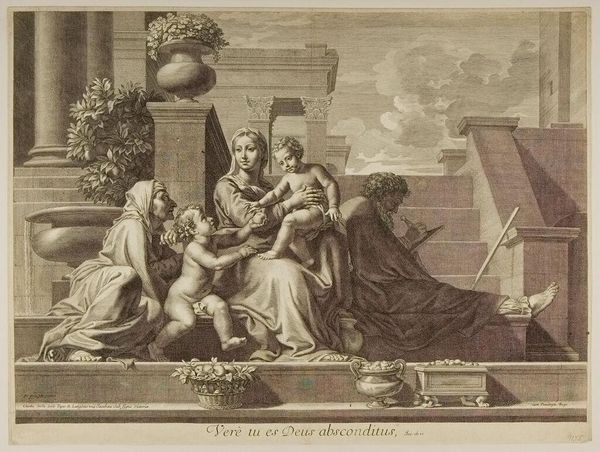 Claudine Bouzonnet Stella created this print, Holy Family on the Steps, in France in the 17th century. It demonstrates a society that was deeply shaped by religion, and the institutional power of the church. The image depicts the Holy Family—Mary, Jesus, and Joseph—in a classical architectural setting, an attempt to associate the Christian story with the grandeur of ancient Rome, so valorized in French culture at the time. However, this is also a domestic scene, showing the family in a moment of intimate interaction. It is trying to create a connection with the viewer, to bridge the gap between the divine and the everyday, to make religion relatable. To fully understand the intent of an image like this, one must understand its social context and its patrons. Looking into archives, letters, and other historical documents, one might further understand the artist’s own beliefs and intentions, and the market for religious imagery at that time.