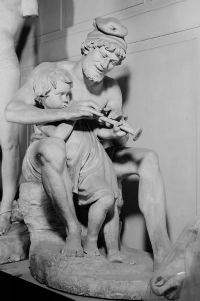 Editor: This arresting piece is titled "The Return of the Prodigal Son," sculpted in wood by O. Evens in 1858. The figures convey an incredible tenderness despite the rigid material. What elements of form strike you most in this sculpture? Curator: Formally, the contrast in posture between the standing father and kneeling son dictates the reading. The father's downward bend is met by the son’s reaching arms, forming a visually complete, almost closed composition. Observe the lines created by the drapery – how do they direct our eye? Editor: I see how the father’s robe creates vertical lines which contrast to the curving shape of the son’s body, highlighting their different roles in the narrative. Does the choice of wood, with its visible grain, influence your interpretation? Curator: Absolutely. The grain adds texture and movement, denying a perfect, polished surface. This is crucial. Semiotically, the unrefined surface mirrors the son's abject state. Do you note any imperfections that seem intentional? Editor: I do notice deliberate marks, particularly around the son's head, adding an urgency to his repentance. The sculpture feels immediate rather than idealized. Curator: Precisely! The artist consciously manipulated form and texture. Its visual impact underscores themes of humility, forgiveness, and the beauty of the imperfect. A poignant expression articulated through materiality. What do you take away from this formal analysis? Editor: Understanding the lines, texture, and implied movement truly enhanced my appreciation. I see how deeply meaning is embedded in every sculptural choice. Thank you! Curator: Indeed. Such close looking deepens one’s artistic perception immeasurably.