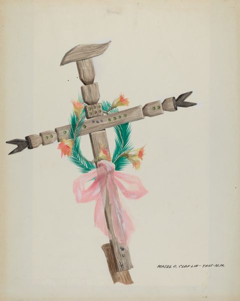 Editor: Here we have Majel G. Claflin's "Cement Head Stone," created around 1937. It seems to be a watercolor and ink drawing, a miniature of sorts, of a folk-art cross. There’s something almost whimsical about the bright colours and naive style, which really draws me in. What's your interpretation of this piece? Curator: Whimsical is a perfect word! For me, it whispers of devotion rendered with such tenderness and informality, which I find so profoundly moving. It's as if Claflin has captured the essence of faith in the everyday – a humble, personal spirituality. Do you notice the way she combines geometric shapes with naturalistic elements like flowers and birds? Editor: Yes, the juxtaposition is quite striking! The rigidity of the cross is softened by the organic motifs, and how the artist paints with vivid color palette, as opposed to dark heavy ones that symbolize the event, giving it a very accessible almost 'happy' feeling. Curator: Precisely! I see this piece not just as a depiction, but also as a meditation. The artist engages in visual poetry by giving symbolic tribute to faith, which feels refreshing. Editor: That's insightful. The painting's miniature format really adds to that sense of intimacy. I now understand how this seemingly simple cross speaks volumes about faith. Curator: Agreed! The experience shows how artists may adopt religious concepts with colorful personal symbology to illustrate spiritual reflection, rather than doctrine or dogma.