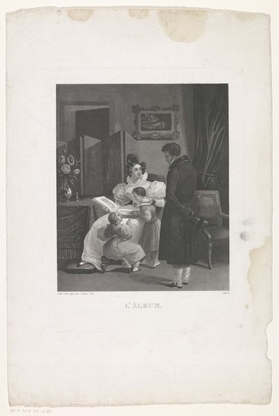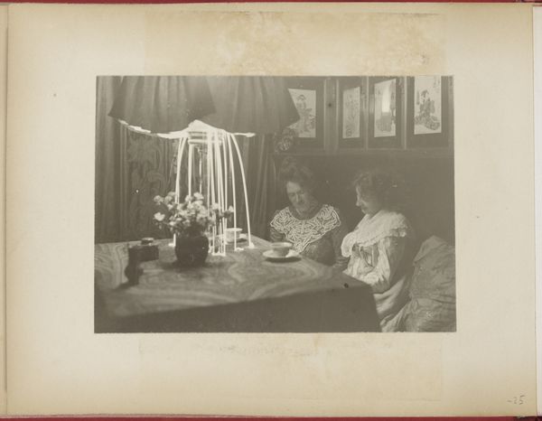 Curator: Welcome. We're looking at Edgar Degas' photograph, "Paul Poujaud, Mme. Arthur Fontaine, and Degas," a gelatin silver print taken around 1895. The photograph captures a seemingly candid moment indoors. What are your initial thoughts? Editor: It feels posed, despite its appearance of spontaneity. I'm struck by the contrast between the rather mournful, perhaps bored, figure on the left, and the intense interaction between the other two figures. There's a narrative here, even if we don't know the precise story. Curator: Degas, known primarily as a painter and sculptor, experimented increasingly with photography later in his career. The art world at this moment saw the rise of photography. The subject matter that painters pursued changed dramatically and paintings shifted from portraiture to capturing scenes that appeared less formal and captured leisure, similar to Degas. Photography was a method Degas used to study figures and test compositions before he began painting. Editor: Absolutely, but I think there's something more to it than simply a study. Consider the power dynamics at play. The men, Poujaud and arguably Degas through his implied presence, seem to be vying for Mme. Fontaine's attention. The positioning—the woman seated, the men leaning in—suggests a specific kind of social positioning common in that period. Curator: Degas' work often depicts women in unconventional poses and unguarded moments, like we see here with Mme. Fontaine who looks tired. He sought to capture realism. Do you view his focus as respectful to his sitters, or exploitative? This is a common issue raised concerning his ballet paintings and sculpture, too. Editor: I see it as a bit of both, honestly. There's an undeniable voyeuristic quality. His art certainly wasn't apolitical. Degas’ work reflects an attitude toward women as objects. Also, how do we view photographs taken in domestic settings by a male artist from today's perspective when debates of privacy and patriarchy remain pertinent? Curator: Those debates feel important to continue examining today as they speak to issues in representation of our own time. Beyond these discussions, though, what's striking about this photograph technically? Editor: I’m drawn to how Degas used the artificial light indoors, particularly its effects on the mirror's reflection. The focus isn't uniformly sharp. It enhances the dreamlike, slightly unsettling atmosphere, almost as if we’re peering into a private, fleeting moment. Curator: Degas played with the developing technology available. The image is grainy, which he probably welcomed since it blurred edges and made lines appear softer, just as they do in impressionist paintings. Thanks for sharing your perspective on this photograph and bringing social power dynamics into our understanding. Editor: It’s been my pleasure. Analyzing art with a keen eye on historical context—who benefits, who is excluded—always enriches the experience for me.