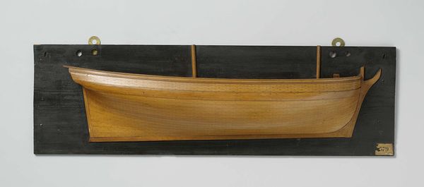 This 'Half Model of a Paddle Steamer' was made by the Koninklijke Fabriek voor Stoom- en andere Werktuigen. Here, the smooth, polished wood of the vessel contrasts starkly against the dark, matte backdrop, immediately drawing the eye to its form. Note the meticulous detail in the horizontal lines that delineate the ship’s structure. These lines are not merely decorative; they’re fundamental to the piece's design, emphasizing the vessel's linear elegance and streamlined shape. The model cleverly uses scale and proportion to convey its engineering essence. The paddle wheel, centrally positioned, dominates the composition, a visual signifier of the ship's propulsion technology. This is more than just a representation; it's a celebration of industrial progress. The choice of wood, too, is significant. Its warmth and texture lend a human touch to an object of industry. Ultimately, this half-model balances aesthetic beauty with technical precision, illustrating the harmonious relationship between form and function. It invites us to appreciate the beauty inherent in engineering and design, which is an ongoing dialogue between art and industry.