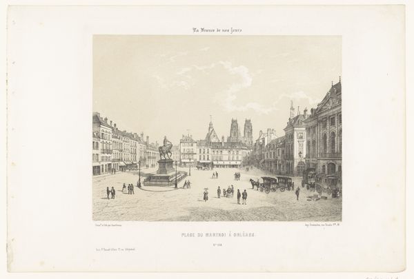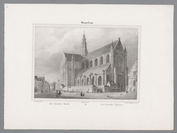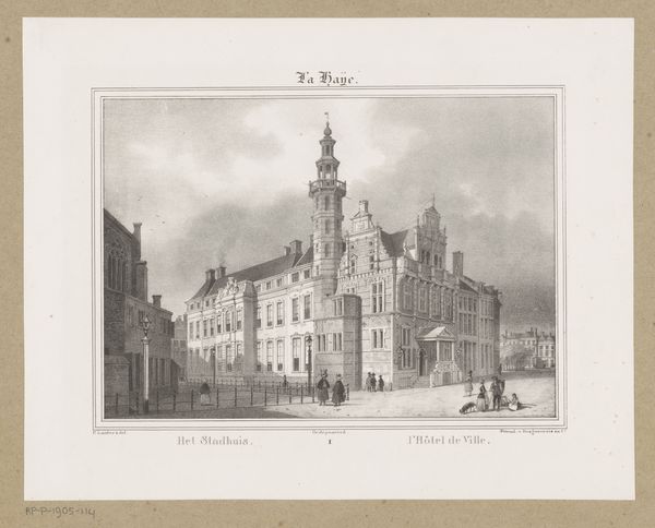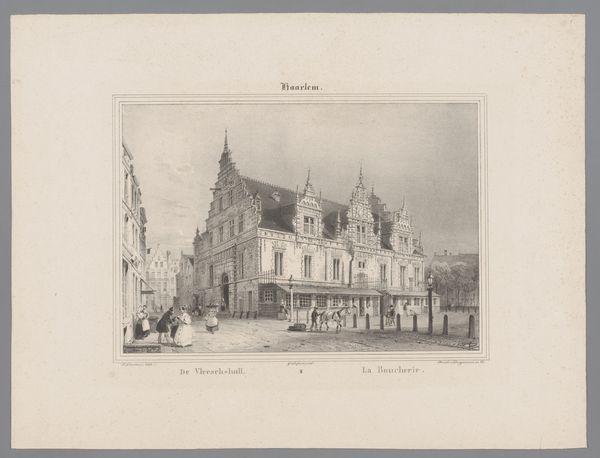 Curator: Here we have "Gezicht op de Vleeshal aan de Grote Markt in Haarlem," a print attributed to Paulus Lauters and dating from 1827 to 1900. It depicts a view of the Vleeshal, or meat market, in Haarlem. Editor: It strikes me as stark, almost architectural in its precision. The grey scale emphasizes the building's heavy stone facade, and even though there are people, the scene feels quite…austere. Curator: Lauters situates us in a rapidly urbanizing Dutch landscape, capturing the burgeoning commercial life of the time, though I agree with your characterization of austerity, which connects to deeply ingrained religious anxieties present in art of that era. The architecture becomes a site of capitalist expansion, yet simultaneously signifies older moral regimes and regulations related to food practices and consumption. Editor: Absolutely. It’s a material record of that transformation. You see the cobblestones underfoot, feel the weight of that stone building pressing down. Consider the labor involved in quarrying, transporting, and constructing that building — the literal building blocks of the marketplace are steeped in socioeconomic conditions. The engraving medium itself—the plates, the ink, the pressing—mimics the production ethic of the setting. Curator: What's compelling to me is considering the positionality embedded in the artwork. Who has access to this space, to this depiction of Haarlem? The composition centers a very particular view. One that elides, erases other perspectives, genders, races... Whose city is this? And whose access are we implicitly championing as viewers? Editor: I'm thinking also about the audience that could be expected for this print, which will influence what it can express, and also perhaps, in what settings could the production of prints happen most effectively, and how does that impact distribution networks for those works. Curator: Considering distribution networks is vital to seeing how the Vleeshal transcends simple commerce. It becomes a symbol of civic identity, particularly during a time when Dutch national identity was being both forged and fractured. The building, rendered visible via the prints medium is not just a marketplace; it is a signifier of a shared past, though shared only with select identities within the region and its colonies. Editor: The work shows an active place, a crossroads. While we look into the historical, political, economic context, and debate meanings and the material base that informs its content, there are many more interpretations and connections that can be extracted from this image through different positionalities. Curator: Indeed, reflecting upon what perspectives remain hidden is critical, for what remains unspoken informs that which is prominently presented.