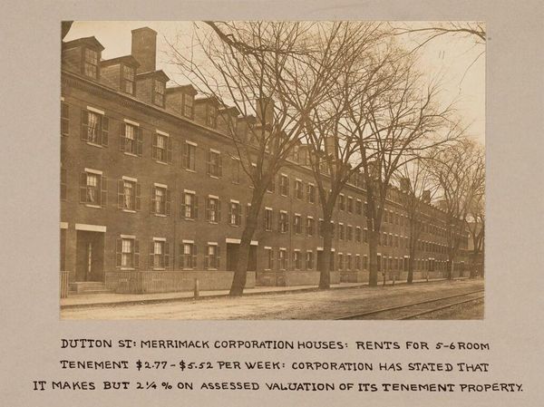 Curator: This is a photographic print titled "Housing, Conditions: United States. Massachusetts. Lowell: Housing Conditions, Lowell, Mass.: Boott Corporation Houses." Editor: Bleak. That's the first word that comes to mind. The bare trees clawing at the sky, the regimented windows... It feels oppressive. Curator: The image, though undated, likely captures a moment when housing provided by corporations was shifting into private hands. Notice the uniformity, a visual echo of industrial efficiency. Editor: Right, it's like a machine for living, not a home. The doubling of rents... that's not just economics, it's a symbolic violation of basic human dignity. Curator: Absolutely. The house, archetypically a safe haven, becomes a site of exploitation. These buildings become symbolic of class disparities. Editor: It's a potent reminder that even the most mundane scenes can carry heavy historical and emotional weight. Curator: Indeed, a powerful meditation on how housing can be both shelter and a cage.