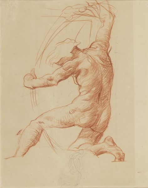 Editor: Here we have Pierre Puvis de Chavannes' charcoal drawing, "Homme brandissant un sabre", from somewhere between 1866 and 1869. It depicts a man brandishing a sword, seemingly caught mid-motion. I’m struck by the sketchiness of the lines; it feels unfinished and raw. What do you see in this piece? Curator: Focusing on the material aspects, notice the very deliberate application of charcoal. Puvis de Chavannes isn't trying to hide the process here; the smudges, the visible lines, are all part of the final image. The economy of means, this deliberate rawness as you put it, speaks volumes about the labor involved. Think about the accessibility of charcoal, a relatively inexpensive material, and its relationship to academic art practices, specifically figure drawing from life. Editor: So, it's almost celebrating the craft of drawing itself? Not necessarily trying to create a polished product but showing us the work? Curator: Precisely! And that ties into the social context of art production. Academic art, traditionally bound by strict conventions and patronage, began experiencing challenges during this period. The shift toward artists becoming independent producers impacted not just subject matter but technique. Editor: That’s really interesting. It makes me think about how the access to affordable materials allowed artists like Puvis de Chavannes to experiment more freely and critique art hierarchies through this sort of 'unfinished' piece. Curator: Yes. Do you see this freedom reflected in the way he depicts movement, without elaborate details and solely relying on raw, rudimentary strokes? It suggests an efficient manner, almost an urgency, as if keen to share his reflection upon artistic conventions. Editor: I do. It seems to subvert expectations, both of subject matter and process. Curator: Indeed, and in doing so, questions established artistic labor and value systems. Editor: I've never thought about approaching it from the labor and material perspective, and it gives me a richer understanding of the artwork itself. Curator: Exactly. Seeing the artist's hand – both literally and figuratively – is vital.