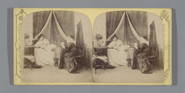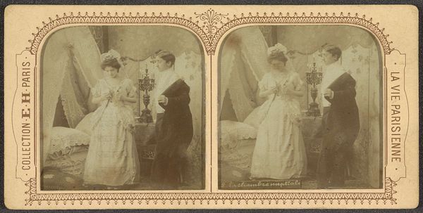 Editor: This is an intriguing vintage photograph, titled "Vrouw kleedt een andere vrouw," dating from around 1880 to 1905. It appears to capture a very intimate moment between two women, seemingly set in a private chamber. The sepia tones give it an almost dreamlike quality. How do we understand this image in the context of its time? Curator: That’s a keen observation. Consider that images like these, particularly depicting such seemingly private scenes, often played a role in constructing and circulating certain ideas about femininity, beauty, and social dynamics. The “genre-painting” theme, alongside the 'nude' tag, is crucial. This photograph circulated commercially, signified by 'La Vie Parisienne'. This isn't merely a captured moment, it's a constructed image, intended for a specific viewership. What societal anxieties or fascinations do you think it might be tapping into? Editor: Perhaps ideas about female companionship, or maybe a male gaze perspective dictating what was considered titillating or acceptable to view at that time? The framing certainly seems staged. Curator: Exactly. The setting, the poses, even the very act of displaying the 'corset,' hints at anxieties around body image and idealized feminine forms which would have dominated popular culture, fueled by early marketing. Was this image intended to shock, to titillate, to instruct? Or perhaps a combination of all three? And how might different viewers at the time interpreted it? Editor: It's fascinating to think about how a seemingly simple photograph could be so loaded with socio-political undercurrents. Curator: Indeed. It highlights how images are never neutral, and their meanings are actively shaped by the societies that produce and consume them. Even a photograph ostensibly showing intimacy reveals broader anxieties and constructs of its era. Editor: This has really shifted my perspective on viewing historical photography; I'll definitely look deeper into the historical context surrounding it. Curator: As we all should.