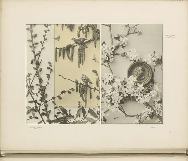 This artwork combines photography and botanical specimens, presenting an intriguing blend of representation and reality. The central image, a still life of fruit and flowers, is rendered through a photographic process, likely photogravure, a technique capable of capturing fine detail and tonal range. Surrounding this is a carefully constructed frame of almond blossoms and butterflies, suggesting a handcrafted element brought into dialogue with mechanically reproduced imagery. The contrast between the photographic depiction and the applied natural elements adds an interesting layer, blurring the boundaries between art and craft. The labor-intensive process of arranging and adhering these delicate materials underscores a deliberate engagement with materiality. The juxtaposition challenges conventional distinctions between fine art and decorative arts, inviting us to consider the social and cultural implications of artistic production. By carefully positioning these natural specimens, the anonymous creator invites reflection on our relationship with the natural world.