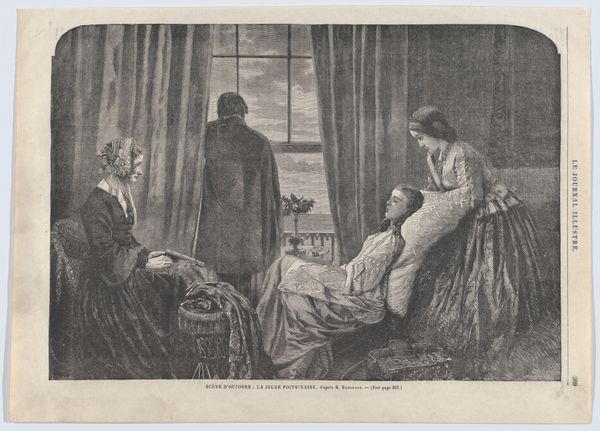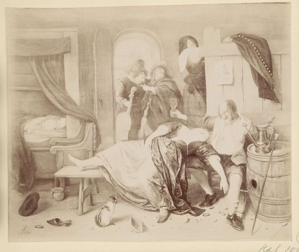 Editor: This is George Bellows' print, "The Last Victim." It's a monochromatic scene, and immediately, I'm struck by the stark contrast and the chaotic composition. What visual elements stand out to you in this piece? Curator: The composition, indeed, is carefully constructed to evoke unease. Note the asymmetrical distribution of figures, the stark contrast between light and shadow. Consider how the artist's use of line and form contributes to the overall dramatic effect. Do you perceive any specific patterns? Editor: I see the repetition of diagonal lines—the window, the bodies—which seems to heighten the sense of instability and violence. Curator: Precisely. The diagonals create a dynamic tension, preventing the eye from resting. This deliberate disruption of visual harmony serves to amplify the emotional impact of the subject matter. We find similar visual techniques throughout art history when tragedy or violence is depicted. Editor: It’s unsettling how the formal elements reinforce the subject matter. I'll definitely look at art with a more critical eye from now on. Curator: As will I.