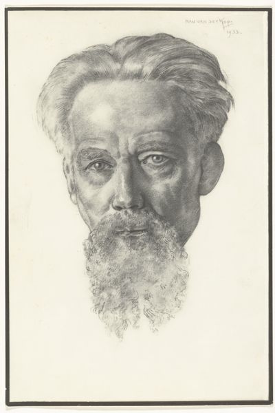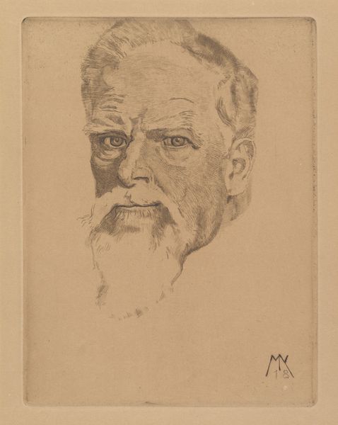 Curator: We're now looking at Alphonse Legros' "Portrait of the Artist, eighth plate," likely created around 1900. It's rendered through etching, engraving, and lithographic techniques on paper. Editor: Goodness, what a weight of the world sits in those eyes! I feel like I've just walked into the presence of an Old Testament prophet—a weary one, at that. There’s a melancholy intensity to the gaze. Curator: Indeed. The composition certainly evokes gravitas. Notice the interplay of light and shadow, particularly how the light emphasizes the brow and the fall of the beard. It's a study in textures created through the precise layering of etched lines. Editor: The beard! It’s practically luminous against the somber hatching elsewhere. Is that purely a play of technique, or a symbolic emphasis on wisdom, perhaps? Makes you wonder what inner landscapes he's charted through his art. Curator: Possibly both. Consider the historical context: self-portraits at this time often served as declarations of artistic intent, visual manifestos. The use of printmaking – combining etching and lithography – afforded a certain reproducibility, enabling Legros to disseminate his image, control it. Editor: Control... Or a kind of melancholy immortality? As an artist myself, I can't help but think about legacy, you know? Does this image become the *mask* by which the world remembers him? Curator: Perhaps it's not a mask, but rather a distilled representation. Legros seems less interested in surface appearances than in conveying an essential, enduring self. See how he crops the composition; it forces our gaze to remain on the face. Editor: Cropping makes for interesting dynamics here. The absence of any background or setting shifts focus entirely towards those eyes…and the brow— so central to projecting a powerful and piercing gaze—as if inviting the viewer into a kind of silent communion. It leaves me strangely pensive. Curator: It leaves me considering the formal ingenuity with which Legros orchestrates visual tension. The stark whiteness of the beard anchoring the portrait... a structural, nearly architectural effect of graphic arts. Editor: You know, after reflecting on Legros' portrait, I’m pondering the solitary path artists often tread – grappling with fleeting insights and molding them into enduring testaments. It's heavy stuff, literally etched in the weight of that brow!
