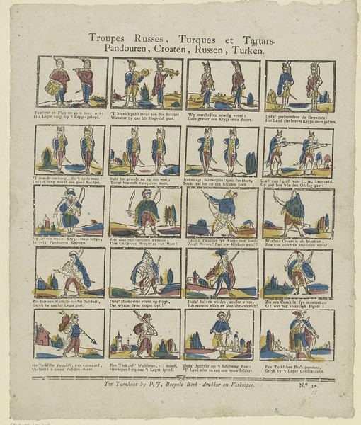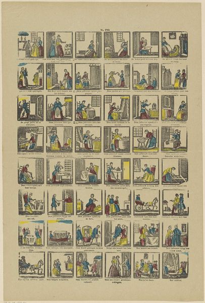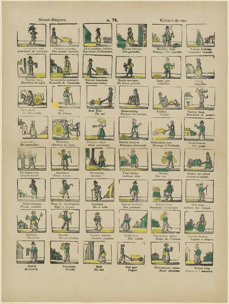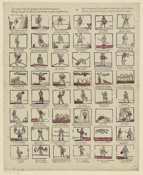 Philippus Jacobus Brepols created this print, "Kinder-oefeningen / Récréations de la jeunesse," using etching. The work likely dates to the early 19th century in the Netherlands. Here, a grid presents scenes of children's games and pastimes. It suggests a world of youthful innocence and carefree activity. The text in two languages, Dutch and French, underscores its appeal to a wide, cross-cultural audience. Prints like these reveal the rising importance of childhood in the 19th century, a time when new ideas about education and child development were emerging. It served as a moralizing tool. By studying such prints in the context of period literature, educational pamphlets, and children's books, we can appreciate how images contributed to shaping the modern concept of childhood and the social norms attached to it.