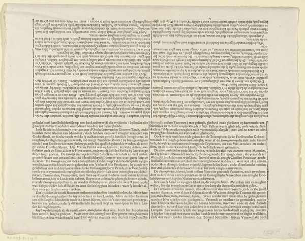 Curator: What we're looking at here is a print from 1697 by Jan van der Heyden, currently held at the Rijksmuseum. It's entitled "Blad met de gedrukte getuigenissen van Ruben en Jacob van der Helling inzake de slangbrandspuiten," which translates to "Sheet with the printed testimonies of Ruben and Jacob van der Helling regarding hose fire extinguishers." Quite a mouthful, isn’t it? Editor: My first impression? It feels like I've stumbled upon a seventeenth-century blog post! The density of text, the straightforward presentation—it’s oddly familiar and strangely charming. The tone is informational and practical but the format feels monumental. Curator: Indeed. The text itself, engraved on paper, functions almost like a broadside, aimed at disseminating information about new technology. Specifically, these hose fire extinguishers, and their efficacy. This connects directly to van der Heyden's work not just as an artist, but as an inventor. Editor: So it’s about celebrating civic innovation through print. Is it effective in the promotion of an amazing, life-saving invention if it's also pretty ugly? What emotional impact do we assume this paper object must have had for a potential client for van der Heyden’s pumps? Is it more moving to the readership, if it's also easier on the eye? Curator: What is interesting to me is how typography plays such an important and practical role in creating both this artwork’s beauty and its functionality, considering both form and content—making art almost purely based in commerce. Editor: Right! The way those dense blocks of text are arranged creates a visual rhythm, but at the end of the day, this arrangement may feel like a practical one in order to fit the most information. I love the fact that the artist wasn't even thinking of artistic considerations. The efficiency is lovely, maybe in the absence of some other aesthetic sensibility. Curator: It underscores how art during the Dutch Golden Age was deeply entwined with commerce and civic life. What is more exciting is recognizing the labor involved and appreciating its intention more than the aesthetics. Editor: So, in a way, looking at this "sheet of testimonies" pulls us into the world of 17th-century Amsterdam: fires, innovations, and the very human need for security. And I can't think of another kind of artwork to achieve this in a similar fashion.