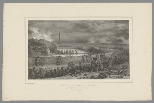 Editor: This is “French and African Soldiers in Combat with the Arabs, 27 November 1836,” an engraving by Auguste Raffet from 1837. It’s quite a scene—so much chaos and movement! What’s striking is the stark contrast between the dense cavalry charge and the more static French infantry. How do you interpret this work? Curator: Well, looking at this print, I’m immediately drawn to the visual encoding of colonialism and the “civilizing mission” of the French. Raffet depicts a specific moment – a charge on the Algerian city of Constantine – that speaks to a broader, more fraught historical narrative. Notice how the “French and African” soldiers are presented. The use of “African” in the title flattens the complex diverse origins to those who were forcefully engaged in the conflict. Editor: So you see this less as a straightforward battle scene and more as a visual argument? Curator: Precisely. Think about who this image was intended for: a European, likely French, audience. It portrays France's colonial endeavors as bringing order and civilization to a seemingly chaotic “Arab” world. Consider also the visual language: the French infantry, depicted with clear lines and organization, stand in contrast to the almost amorphous mass of the charging cavalry. This juxtaposition subtly reinforces a sense of European control and rationality versus perceived Arab disarray. Editor: That's interesting; I hadn’t considered the intended audience so directly. Does the date – 1837 – further contextualize the work's meaning? Curator: Absolutely. This image appeared relatively early in the French colonization of Algeria. It played a role in shaping public opinion and justifying the colonial project. We should ask, how did images like these shape perceptions of the "Other" and legitimize imperial ambitions? How did they construct narratives of power and difference? Editor: This really makes me think about how art functions not just as a record but as a powerful tool shaping our understanding of history. Thanks. Curator: Indeed. It highlights how art is always embedded in networks of power and meaning, playing an active role in shaping social and political realities.
