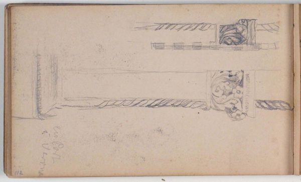 Curator: Welcome. Here we have Niels Larsen Stevns' "Søje fra S. Bernadino, Bologna," a pencil and coloured pencil drawing from 1896. It's currently held at the SMK, the National Gallery of Denmark. Editor: My initial impression is one of classical restraint. The sketch presents two distinct architectural fragments, almost austere in their simplicity. Curator: The drawing focuses on classical architectural elements. Think of it: stone hewn from the earth, transported, and then shaped by skilled artisans to form these elements. Their placement elevates them from mere material to something… spiritual, almost. Editor: I'm particularly struck by the composition itself. The choice to depict the architectural components in an isolated manner allows one to contemplate the abstract beauty of geometric form, to decode Stevns’ choice of medium and strokes. How the strokes depict mass and light. Curator: Absolutely. Consider too the artistic conventions in place at that time—the emphasis on historical subjects, academic precision… Stevns had the option of capturing the world, but instead focuses on this artifact. A reflection on past power and the current day artisan? Editor: I'm fascinated by the deliberate incompleteness, which is highlighted in both the capital on the left and what could perhaps be the top portion of a plinth on the right, giving an illusionary appearance through line and form. Curator: It evokes a poignant feeling of impermanence, or memory itself—fleeting, fragmented and rebuilt, and then gone again. It makes us consider what’s left of a past civilization. Editor: Indeed, the drawing masterfully conveys this architectural subject into pure visual elements, independent of any external narrative. Its essence lies in its ability to evoke visual perception through minimal means. Curator: For me, Stevns reminds us of how we assign meaning and value to remnants. What they stood for versus their material nature now separated from society. Editor: Agreed. The artwork provokes reflection on the interaction between the artist’s execution, architectural elements, and a meditation of perception itself. Curator: A confluence of the material, historical, and ephemeral captured on paper.