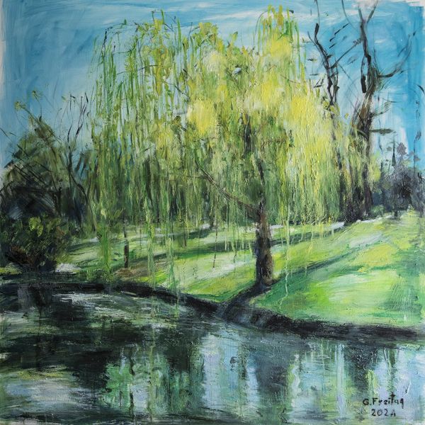 Gazmend Freitag made this oil on canvas painting called Donau Linz in 2021. It’s a landscape, but more than that, it’s an exploration of the act of seeing. Look at the way the paint is applied, loose and free, capturing the fleeting quality of light on water. The thick brushstrokes of vibrant green in the foreground, become these expressive marks that feel urgent and alive. It’s like Freitag is showing us how he sees, not just what he sees. I’m drawn to the little boat, sitting still near the river bank. It’s a simple shape, but it holds so much weight in the composition, anchoring the scene and inviting us to contemplate the quiet beauty of the moment. It is reminiscent of work by German Expressionists like Emil Nolde, who also used bold colour and expressive brushwork to capture the emotional intensity of the landscape. Like them, Freitag embraces the ambiguity of art, inviting us to bring our own experiences and interpretations to the work.