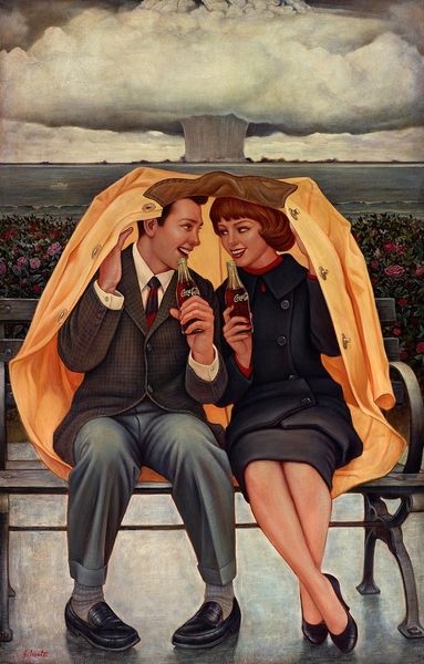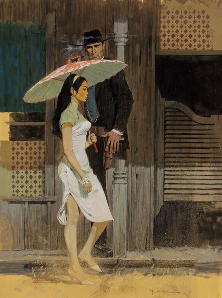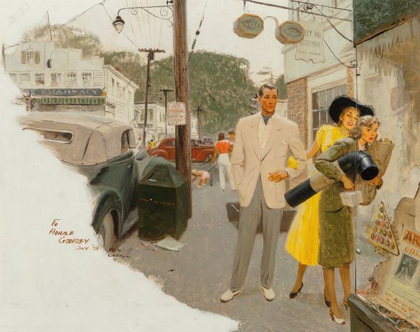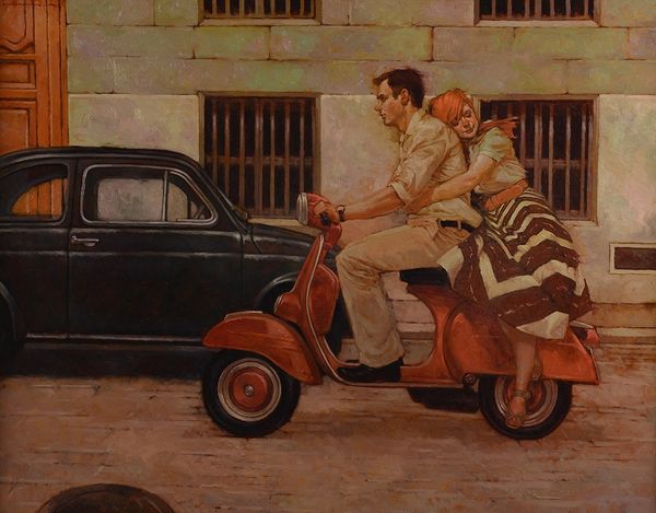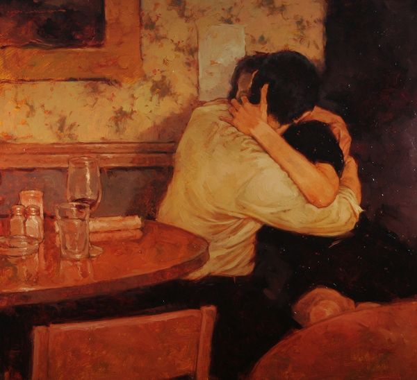 Joseph Lorusso painted 'The Long Fare' to capture a universal emotion. The painting situates us on an anonymous street corner in a city that feels like New York, where a man and a woman are caught in a passionate embrace next to the iconic yellow cab. Lorusso’s painting operates within the visual language of advertising and cinema. The embrace between the figures is a central image that plays on the romantic ideal - it might even be a farewell. There is something performative about this kiss, as it happens in public, even for each other. The setting sun casts long shadows. This scene is intimate, yet public, and explores the complexities of modern relationships against the backdrop of urban life. Lorusso captures a poignant moment of connection and departure in the fleeting encounter. There's an unspoken story, a blend of longing and resignation, which captures a deeply human experience, making the image all the more resonant.