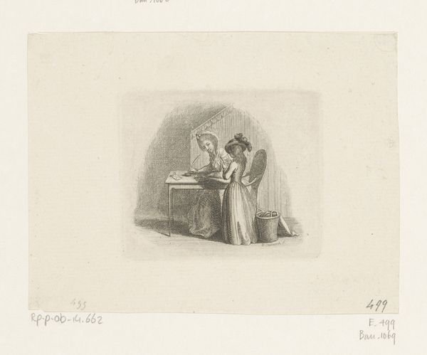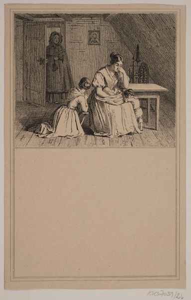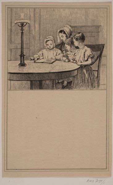 Editor: This is Adolph Kittendorff's "Indledning. Prøvetryk til Chr. Winther og M. Rørbye, "25 Billeder for små børn"," a lithograph from 1846. It's a very intimate scene, almost claustrophobic. What strikes me most is the contrast between the quiet concentration of the children and the unseen story within the book. What do you see in this print? Curator: What I find compelling is the lamp – not just as a source of illumination, but as a beacon of knowledge. Consider the cultural symbolism of light throughout history. It’s intrinsically tied to enlightenment, wisdom, and spiritual awakening. And the mother… see how her presence almost blends into the background? Her gesture seems very deliberate, almost protective of her children and their learning. Does this image trigger any cultural memories for you, perhaps from your own childhood? Editor: I hadn't thought about it that way, but it reminds me a bit of my grandmother reading to me and my cousins, that feeling of being safe and enveloped in stories. But is it really that simple, or are we projecting modern sentimentality onto a 19th-century image? Curator: That’s a fair point! Consider that in Romanticism, childhood was often idealized as a state of innocence, a direct conduit to nature and feeling. This print is designed for children, therefore it could evoke similar values in that specific audience, imbuing the viewer with the lessons about familial relationships. However, let's not forget the power dynamics at play - the mother as the primary educator in the domestic sphere. This isn't just about a cozy scene. Editor: I see your point. There's definitely a complexity I didn't appreciate at first glance. Thinking about it symbolically adds a whole other layer. Curator: Indeed. Art often speaks in whispers, using symbols to trigger deeper cultural associations. By observing the visual language and considering the historical context, the print then encourages to recall memories that are unique for all of us. Editor: Thank you. This perspective completely changes how I view the piece. It's more than just a genre painting, it's a layered symbol of learning, family, and cultural ideals.