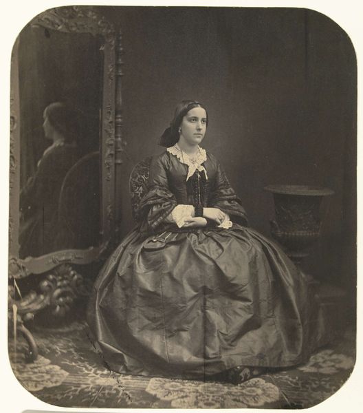 Editor: This is a photograph of Elizabeth Hamilton Halleck by Mathew Brady, currently at the Harvard Art Museums. It's striking how posed and formal she looks. What do you see in this portrait? Curator: Beyond the individual, these early photographs served a vital social function. They democratized portraiture, allowing a wider public to participate in visual culture and construct their own narratives of identity. Editor: So it's about more than just capturing someone's likeness? Curator: Exactly. Brady was shaping how the public saw and remembered individuals. The very act of sitting for a photograph became a statement, didn't it? Editor: I hadn't considered the power dynamic inherent in that. Thanks!