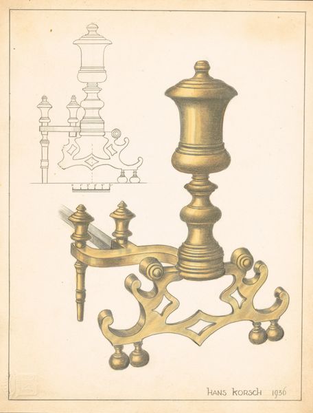 Editor: So, we’re looking at a watercolor drawing by Jack Staloff titled "Candlestick," from around 1936. I’m immediately struck by its technical quality, how the medium captures the metallic sheen. What stands out to you? Curator: The method of production here really directs my eye. This isn't just an image of a candlestick, it's a plan, almost like a technical drawing for manufacturing. Notice the “inches” scale. It suggests mass production, not unique craftsmanship. This challenges our traditional notions of "art." Editor: I see what you mean. It does have that blueprint feel. Does that make it less of an artwork somehow? Curator: Absolutely not! It asks us to consider the socio-economic factors that shape artistic expression. During the 1930s, the lines between design, craft, and art became deliberately blurred. Staloff, by presenting this object as a potential commodity, is commenting on labor and industry in the context of art production. How does mass production impact originality? Editor: So, by presenting the design so plainly, he highlights the industrial process itself. And this drawing becomes, in its way, a record of that process and even critiques it. Curator: Precisely! He foregrounds the materiality and labor involved in the creation, not just of this image, but of all the possible candlesticks it represents. The watercolor and drawing medium becomes the tool of both artistic creation, documentation, and commercial enterprise, and this complicates our perception of ‘art’ in terms of how it's being distributed. Editor: That's really fascinating. I wouldn't have thought to look at it that way. This really opens my eyes to a whole new way of looking at art. Curator: Agreed, and the object itself then serves as a point of contemplation beyond the surface. Hopefully it opens our audience's perspective, too!