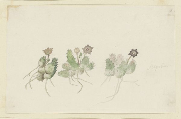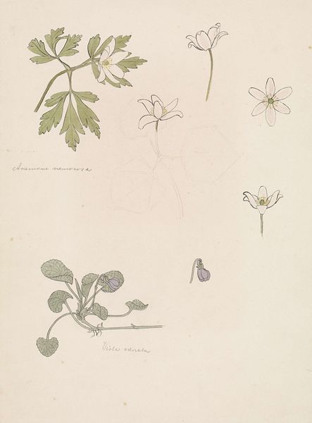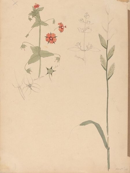 Editor: Here we have Julie de Graag's "Studieblad met gladiolen en appelbloesem," dating sometime between 1887 and 1924. It's a botanical study rendered in pencil and watercolor on paper. There's something very delicate about the linework. What stands out to you in terms of the making of this piece? Curator: What intrigues me are the presumed economic and social conditions enabling its production. Who was de Graag creating this for, and with what resources? Was this commissioned work, part of a formal study, or simply an act of personal observation and documentation afforded by her socioeconomic privilege? Editor: That's interesting, I was more focused on the composition itself, how the individual floral studies are placed on the page, but your questions open up a whole new perspective. Do you think the medium itself, watercolor and pencil, tells us something about the potential function or intended audience of the piece? Curator: Absolutely. Pencil and watercolor were relatively accessible materials. The choice speaks to the scale and intimacy of production; not demanding the industrial might of oil paints or large-scale canvases. It also speaks to its possible distribution – as part of a larger catalogue of studies, maybe even something akin to a commercial venture, where multiple prints were being generated to sell. Was she part of a growing class of female artists, making her income this way, or working independently, defining herself and maybe even other artists, who chose art to earn a living and contribute to society's economy? Editor: So, you’re suggesting we can see the art as connected to a shift in artistic production and distribution, linking to larger questions of class, gender and economy in that era? Curator: Precisely. These are not just pretty flowers; it’s a material record, intertwined with social relations and perhaps an independent woman asserting her role within a rapidly changing marketplace for art. It encourages us to challenge conventional assumptions about art's purpose. Editor: That completely reframes my initial appreciation. It's amazing how analyzing materials and social contexts adds layers of meaning. Curator: Exactly! And it reminds us to always consider who benefits from art, and who is making it—and why.