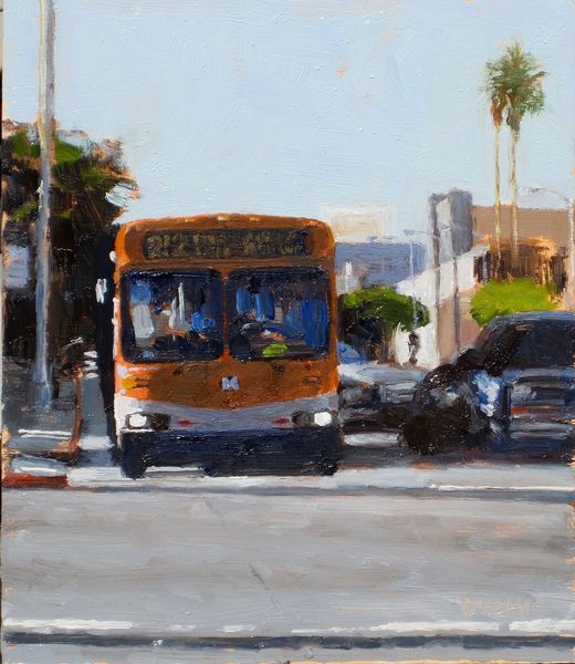 Editor: This is "The Sign On The Hill" by Dan Graziano, it seems to be an oil painting. I'm immediately struck by the light, it has this almost dreamlike, hazy quality. What do you see in this piece? Curator: Oh, that haze… it's pure California dreaming, isn't it? It almost feels like you're peering through a sun-soaked lens, slightly out of focus, which, in a way, is what Hollywood sells us – a romanticized version of reality. Notice how the palm trees almost seem to dance, blurring the line between reality and fantasy, much like a movie set. Does it feel like that to you, too? Like a half-remembered dream? Editor: Definitely! And the way the Hollywood sign itself is almost a ghostly presence in the background… it’s iconic but also quite faded. Curator: Exactly! It's like a memory, isn’t it? The sign, in the distance, symbolizes ambition, success, the promise of fame, but it's presented with this layer of gentle detachment, of perhaps the artist reflecting on what those promises truly mean. It invites us to look beyond the shiny surface, perhaps at the everyday life happening right beneath it. Are we focusing on the symbol or on the reality below? Editor: That makes a lot of sense. It’s less about the glitz and glam and more about the subtle, quiet beauty of the scene. Curator: Yes! There's a certain peace in the everyday, isn't there? Graziano reminds us to look at our surroundings, even those overshadowed by giant symbols, with fresh eyes. The value of ordinary moments; the poetry of the mundane. What will you notice on the way home? Editor: This really changed my perspective, I initially overlooked a lot of those subtle details in favour of what I thought was more important but now appreciate. Curator: It’s the same for me. I love seeing iconic art through somebody else's eyes.