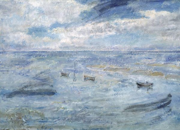 Curator: "Fishing sardine boat" by Maxime Maufra, painted in 1909 using oil on canvas. An atmospheric vista of maritime labor. Editor: My immediate impression is one of quiet industriousness, a gray-blue symphony with tiny figures bravely facing a vast, turbulent sea. Curator: Indeed. Maufra's application of paint creates a choppy, textural surface for the water. Note the rhythmic brushstrokes mirroring the waves' undulations. The muted palette underscores the somber reality of these fishermen's lives. Editor: It speaks volumes, doesn't it? These small boats are rendered almost insignificant against the weight of the clouds above, the implicit power of nature looming large. How might social and economic circumstances shaped the reality depicted here? Curator: We see a representation of early 20th-century fishing practices, small-scale ventures confronting an unpredictable environment. Consider, too, the art market: landscapes like this were increasingly sought-after by the burgeoning middle class, romanticizing the everyday lives of rural laborers. Editor: Romanticizing or perhaps bearing witness? Maufra positions the viewer at eye-level, directly in line with the boat's trajectory, thereby forging a connection between subject and audience, between labor and leisure. It strikes me as powerful rhetoric. Curator: An astute point. The composition’s receding perspective focuses on that single vessel as a point of narrative tension, emphasizing not just what they are doing, but the challenging conditions. The figures almost disappear. Editor: Yes. Their diminished presence suggests the precariousness of their livelihood. What seems initially picturesque reveals deeper, more complex reflections on man's relationship with nature. Curator: By focusing on the structure and materiality, we see not just boats at sea, but rather a potent visual statement of societal context rendered visible through skilled composition and technical aptitude. Editor: A sober yet captivating testament to both artistry and human endeavor, brought into focus through considerations both internal and external to the canvas itself.