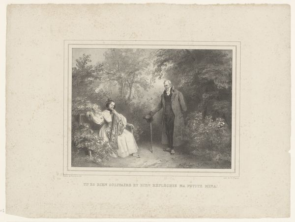Jean-Baptiste Madou’s Figuren flaneren in een tuin, now at the Rijksmuseum, presents figures strolling in a garden using lithography to achieve varied tonal effects. The composition is structured around the interplay of light and shadow, directing the viewer's eye through the garden scene. Madou masterfully uses the lithographic technique to create gradations of tone that mimic the subtleties of natural light. This approach creates a semiotic relationship between form and content, where the texture becomes a signifier of depth, atmosphere, and mood. Through the use of lithography, the scene is more than just a representation; it is an exploration of the medium’s capacity to capture the nuances of light and form. Madou's Figuren flaneren in een tuin demonstrates how the formal qualities of lithography can reflect broader cultural interests in observation and representation, engaging the viewer in a dialogue about seeing, interpreting, and the materiality of art.