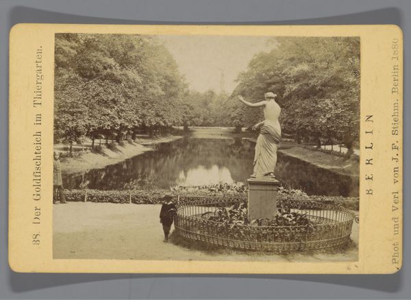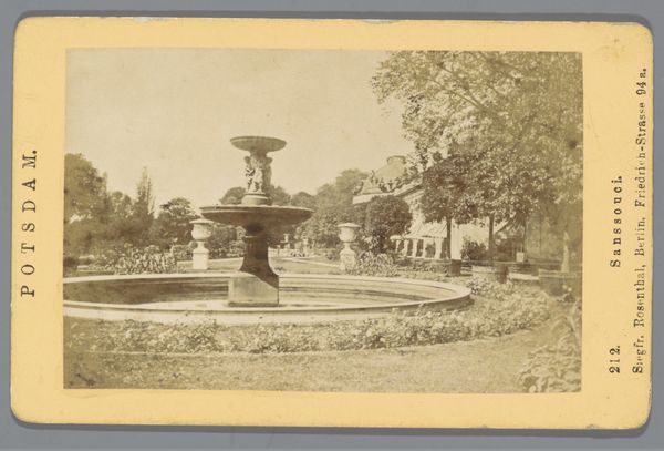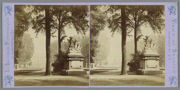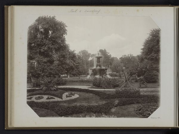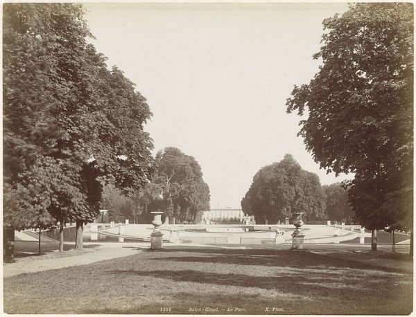 Editor: So, here we have "Gezicht op de Janssingel in Arnhem," a photograph, specifically an albumen print, potentially created between 1850 and 1886 by Brainich & Leusink. The sepia tones give it a real sense of age. I’m struck by how the receding lines of trees create depth. How do you approach a piece like this from a formal perspective? Curator: I’m immediately drawn to the photographer's mastery of composition. Notice how the lines of the trees aren’t just receding; they frame the space. The albumen print provides us with gradations of light and shadow, particularly on the surface textures. Ask yourself, does the light highlight something specific? Editor: Yes, the brightest area is right in the center, around the building at the end of the path. It feels almost staged, with the building as a sort of focal point. It contrasts with the darker foliage framing either side. Curator: Precisely. That play of light and shadow creates a balanced asymmetrical design. One must consider also the geometric organization of the space and the building versus the organic quality of the plants and trees, how those are put in relation, not for any particular external value, but to see what effect that opposition provides to the observer. What does that contrast do for you? Editor: It’s dynamic. It’s not just a flat documentation; it is like the architecture imposes structure over nature itself, the pictorialist manipulation softens it again though. I wonder, am I imposing meaning that isn't actually there? Curator: Meaning arises from observation and interrogation of those pictorial elements. Does the structure invite meaning for you, or impose meaning? The visual properties predate you, or I, the viewer and critic comes second. What strikes me most is the use of form to lead the eye. Editor: This has shown me that analysing the formal relationships within the artwork provides such a clear path into interpreting its complexities. Curator: Indeed, by attending to the visual cues within the composition, we gain a language for dissecting this constructed reality, a grammar through which the past is made present again.