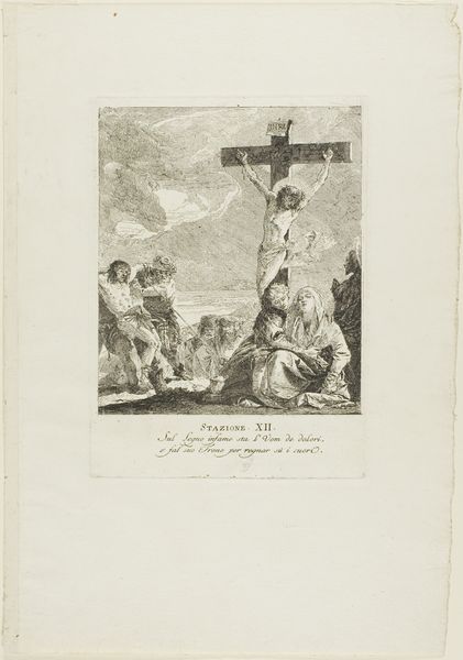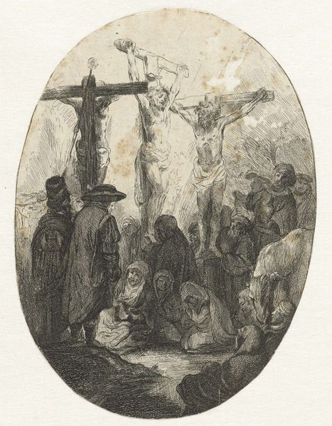 This oval plate depicts the crucifixion scene, etched by an anonymous artist and held in the Rijksmuseum collection. The composition is dominated by the stark verticality of three crosses against a softly shaded background. This simple, yet powerful, arrangement draws the eye upward. The figures below are huddled in grief, rendered with a dense network of fine lines. Light seems to emanate from the central figure of Christ, contrasting sharply with the shadowed onlookers. The oval format compresses the scene. This adds to the emotional intensity by focusing our attention on the interplay between light, shadow, and line. Consider how the artist uses the stark contrast of light and shadow to create a sense of drama and depth. These formal choices serve not only to depict a biblical scene but also to evoke feelings of suffering and redemption. This interplay invites contemplation on the themes of faith, sacrifice, and human experience.