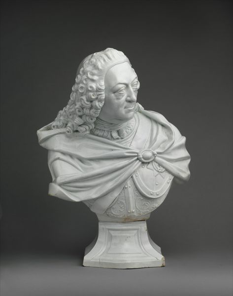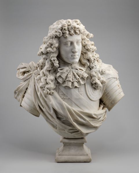 Curator: Just look at that—so much presence. The artist really captured something with that gaze. Editor: Yes, an almost unnerving presence! All those curls and that draped fabric—it's very baroque. Who are we looking at? Curator: This striking work is titled simply “Bust,” created by the Franco-Flemish artist C. Lacroix, sometime between 1695 and 1700. Editor: The materiality stands out to me. That ivory color contrasts elegantly with the dark wood of the stand. How do these kinds of colors usually relate to the subject’s status? Curator: This sculpture emerges from an era steeped in rigid social structures and a fascination with courtly power. In the late 17th century, visual art served as an explicit tool to articulate class distinctions and enforce a divine order. So to answer your question, this gentleman’s aristocratic status is on full display here. His confident expression and opulent garments really represent the way power was perceived and projected in those times. Editor: And speaking of projecting, it seems to draw from the Roman Imperial tradition of portraiture. Curator: Absolutely! In a Europe still dominated by monarchies and powerful men, Lacroix explicitly summons classical grandeur, not just through formal devices, but also through symbolism. Editor: It's quite incredible to see these Baroque symbols echo across centuries. One sees them represented throughout high fashion, right down to our own day! What’s your view on the image's capacity to communicate or express these echoes? Curator: Absolutely! Its legacy persists precisely because it still carries power. I feel it’s really crucial that, even centuries later, we dissect the codes, the messages that shaped those societies and in some cases continue to permeate our world. Editor: Agreed. Visual culture is a language after all! It speaks and deserves to be decoded in order to promote real understanding. Curator: That's such a brilliant point. Well, looking at this Baroque portrait, one thing is clear: its history still speaks, demanding we continue this visual dialogue across the ages.
