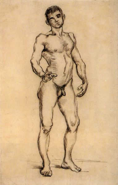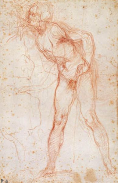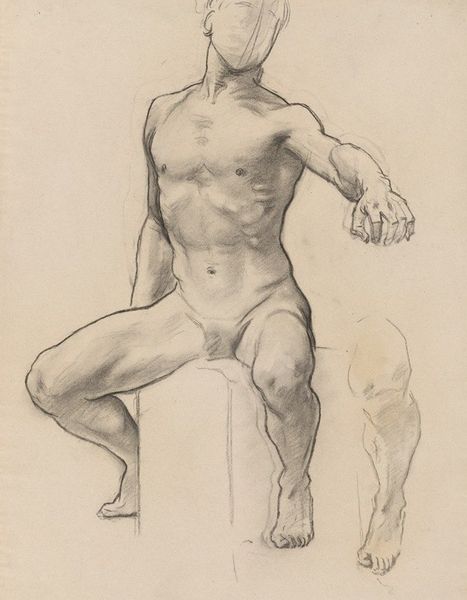 Curator: This is Michelangelo's "Study for Haman," created around 1508. It's a drawing rendered in red chalk and it resides in the British Museum. My first impression is its monumental quality; even as a preparatory drawing, the figure commands attention. Editor: The red chalk itself grabs my attention—I wonder what kind was used and what determined that choice? You can almost feel the pressure of Michelangelo’s hand on the paper, building form through repeated strokes. This is labor and material manifesting before us. Curator: Precisely! The cross-hatching is crucial. Notice how Michelangelo uses it to define the musculature and imbue the figure with dynamic energy. The light seems to emanate from within. It is about an intellectual ideal of the form as the High Renaissance style dictated. Editor: An ideal form achieved through… what? Manual skill! Each line is a physical act of translation. He's rendering flesh and blood using humble materials. The support it's also telling us a lot: How big was it, where was it manufactured? Where did Michelangelo source it? And the economic circumstances around the access he had to high quality paper. Curator: You’re right; one cannot deny the artistry embedded in the materiality itself. But think of the composition—the torso, legs, and feet all meticulously studied separately, as fragments, coming together to inform his larger vision. This echoes classical sculpture—dissected, understood, then idealized. Editor: I’m just drawn to the physicality, the graft, you see, because art doesn’t magically happen, and it doesn't spring up out of genius' head, even in Michelangelo's. The rough, unfinished quality—the exposed processes—reveals that labour. It disrupts the narrative of effortless virtuosity. Curator: Perhaps... and yet, there is still the unmistakable pursuit of perfection through line and form. But I see your point about the raw materiality inviting us to appreciate the work involved. Editor: Exactly. Recognizing labor should not take anything away from the virtuosity, or detract from how intellectual or ideal his goal was, I am just expanding that notion. Curator: Fair enough. Studying its composition alongside its materiality grants a deeper appreciation of this master's practice. Editor: Yes. Focusing on materials reminds us that "genius" is inseparable from human, and material conditions.