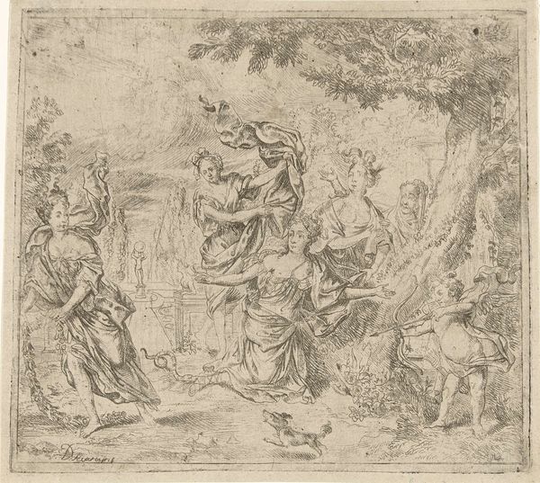 Curator: This drawing, rendered in pen and brown ink, sometimes also identified as a print, is called "The Siege of Fiesole by the Goths," created sometime between 1550 and 1599 by Friedrich Sustris. Editor: It feels very tense, yet remote. The earth-toned wash gives everything a faded, almost dreamlike quality. I’m particularly drawn to the busy foreground against the vast and vague landscape behind. Curator: The siege itself speaks to cycles of power and vulnerability. We know Fiesole for its Etruscan and Roman past, a long view to its narrative, but sieges also function as potent symbols. Beyond historical representation, Sustris taps into collective anxieties about societal disruption, about communities under pressure. Editor: The figures on the right dominate, obscuring the military actions playing out to the left. They create such an intense field of activity! The cross-hatching technique adds depth, but I’m struck by how that busy density contrasts so strongly with the muted lines creating the landscape in the background. Do you think there is an emphasis here, playing out with figuration over pure landscape tradition? Curator: Perhaps. I think that while Sustris was concerned with faithfully conveying a historical event, the universal theme is inescapable, and also a visual encoding for how a society under attack experiences disruption internally: panic, dread, faith. The grouping suggests continuity, an unwillingness to relinquish the familiar ways. Editor: That feels right. Note how the line quality itself shifts to convey depth and hierarchy; the further the lines fall into the distance the softer the rendering. Also notice how he structures the work through the placement of diagonals that thrust across the work – really beautiful organization, drawing you through the space. Curator: And while ostensibly about external threats, the drawing speaks eloquently about internal, psychological, communal siege. It is not so much about physical dominance but social and cultural endurance under stress. Editor: It’s truly impressive how Sustris distills a complex historical moment down to a tension between detail and elision, pushing our eye from chaos into… uncertain safety. Curator: Precisely, and in so doing, gives lasting symbolic weight to history.