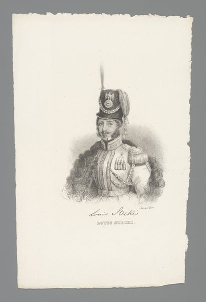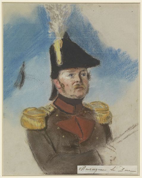 Curator: Right now we’re looking at “Portretstudie van kapitein J.J.P. van Munnick,” which translates to “Portrait Study of Captain J.J.P. van Munnick,” created by Nicolaas Pieneman sometime between 1819 and 1860. Editor: Wow, he really commands your attention, doesn't he? It's almost theatrical, like he’s stepped right out of a play, all imposing posture and elaborate military dress melting out from the edges. Curator: That’s interesting. The watercolor definitely lends a sense of immediacy, capturing a specific moment. I see this work primarily as a visual document, showing us how the Dutch military elite wanted to be seen. Editor: See, I think it’s much more than that. It's like Pieneman caught him between breaths, revealing a flicker of the man beneath the uniform, almost weary if you look closely. The soft washes create this lovely dreamlike atmosphere that contrasts so nicely with the rigidity implied by the uniform. Curator: I'd argue that the romanticism you are feeling in the watercolour, comes primarily from his outfit: high red collar, decorated hat, silver epaulettes—it's designed to inspire awe and reinforce his position. Editor: But that is just part of the effect, the medium lends it vulnerability. And consider the absence of background, this feels like it wants to get at something more immediate, don’t you think? As though Pieneman's less interested in the official story and more in the lived reality of the man. The face. That subtle anxiety? That's where the real story is, not just in the brass buttons. Curator: It does offer a window, certainly, onto the image military officers cultivated for themselves. It's that push and pull, the private individual versus the public persona, that Pieneman so deftly captures. A tension, perhaps, we can still recognize today. Editor: I think it is still relevant because, as always, at the center we are just all people, dressed in various costumes.