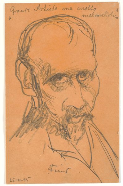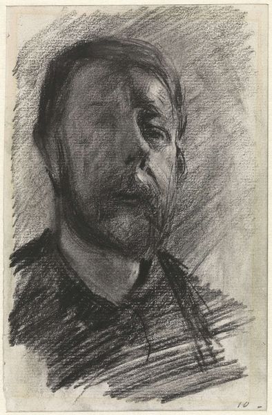 Editor: This is Niels Larsen Stevns’ self-portrait from 1902-1903, rendered in graphite and charcoal. The stark contrast gives it a very intense feel. What do you see when you look at how the drawing was made? Curator: The first thing that strikes me is the directness of the materials. Graphite and charcoal are relatively inexpensive, accessible mediums. Consider the implications of an artist choosing these materials for a self-portrait during this period. Was it a matter of financial constraint, or was there a conscious decision to reject more 'refined' media? How might that choice reflect Stevns’s view of his own labor as an artist? Editor: That’s interesting, I hadn't thought about the choice of materials being a deliberate statement. Does the drawing technique suggest anything about his process? Curator: Absolutely. The visible strokes and smudging indicate a process of layering and reworking. It doesn’t aim for a polished, idealized image. Instead, the emphasis is on the process of *making*. We could ask, what’s the role of imperfection, the rough and raw in conveying sincerity? Editor: So it’s less about the finished product and more about understanding the labor and choices that went into creating it? Curator: Precisely! And how those choices challenge established hierarchies. Is this drawing just a study, a 'lesser' form of art compared to a painting? Or is it actively questioning the value placed on different types of artistic labor and materials? Editor: This has given me a lot to think about. I didn’t expect to consider a simple self-portrait in such a socio-economic light! Curator: Exactly! Art doesn't exist in a vacuum. The materials and the way they're used always have something to say about the broader context of production and consumption.