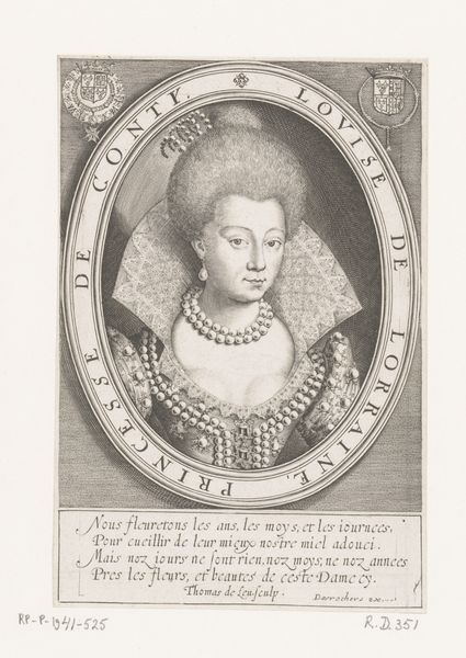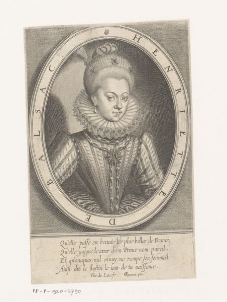 Curator: This is a portrait of Louise of Lorraine, created between 1576 and 1614 by Thomas de Leu. It's an engraving, a print on paper, showcasing the artistry of the era. Editor: It strikes me immediately as intensely formal and decorative. Her dress, her ruff, even her hairstyle... everything seems carefully constructed to project an image of royalty. Curator: Absolutely. The artist was working in a Mannerist style. Look at the swirling text framing the portrait within an oval, practically embracing her image—the entire composition conveys the power and status associated with the subject. As a member of a significant family in European history, lineage was everything. Editor: The ruff, the jeweled ornamentation of her dress—they’re almost like a visual code of her status. The clothing alone signifies power, wealth and dynasty. There's something also in her serene and unreadable expression; I wonder if that lack of expressivity wasn’t also part of the visual language surrounding powerful women at this time. Curator: I think that’s very insightful. What appears almost flat or reserved on the surface, is in actuality quite calculated to embody ideals of grace and nobility—even an element of distance or invulnerability. Her adornments function almost like armor. Her role was largely defined by her connection to powerful men, shaping events by way of dowry, childbirth, and inheritance, so she existed very much within these expectations. Editor: Looking at how certain forms and symbols repeat - those circles, the swirling ornament - do you think they also echo cycles of dynasty or perhaps something about perceived harmony of the soul or society? Curator: That's a fantastic way to think about it. The visual language certainly evokes a kind of perpetual motion or enduring legacy. Editor: Examining it more closely, the artist doesn't just portray an individual; they’re projecting dynastic symbolism for generations to come. It is more than just personal. Curator: Exactly. Artworks like these help us to remember that history is constructed, not simply reflected. We learn about past values and expectations in powerful ways through this artistic expression.