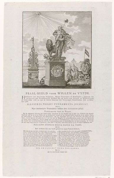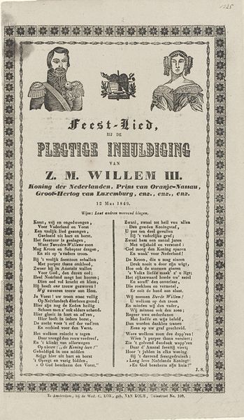 This printed broadside, made in Rotterdam by J. B. Ulrich, celebrates the inauguration of King Willem II in 1840. Its visual design and textual content offer insights into the social and political climate of the Netherlands at the time. The print’s decorative border and prominent lettering frame the proclamation of Willem II as the beloved King. The text expresses expectations that the new King will uphold the constitution and foster national unity. There are also poems and songs celebrating Willem II's ascension, linking him to past glories and military victories, particularly at Waterloo. This broadside is a fascinating artifact for understanding the construction of royal authority and national identity in the 19th century. To delve deeper, researchers can examine period newspapers, pamphlets, and official records to understand the broader context of Willem II’s reign and its reception among different social groups. It reminds us that art and printed matter were vital tools in shaping public opinion and solidifying institutional power.