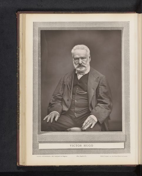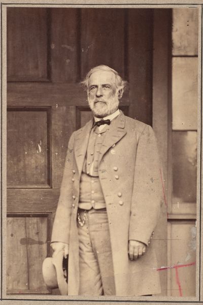 Curator: I'm struck by the rather solemn feeling conveyed in this image. Editor: Agreed. We're looking at a gelatin silver print, produced between 1856 and 1859. It's titled "[Portrait of Major Anderson]" and the photographer, Horatio Ross, has created a very stately impression. Look at the fine grain, achieved through the printing process, bringing depth to the textures of the fabric. Curator: Yes, there’s a deliberateness. Notice how his somewhat stern gaze connects directly with the viewer. It creates a directness despite the physical distance and the passage of time. His holding a document, and the cane… they speak of authority, or at least a certain gravitas expected from someone in his position. Editor: The composition, with Major Anderson seated slightly off-center, also reinforces a feeling of accessible power, wouldn’t you say? The dark coat contrasts nicely with what seems to be an unstarched white shirt, a casual, and almost nonchalant signifier of upper-class nonchalance. Curator: And there is the detail of the cane. Its presence seems ceremonial as well. Canes and walking sticks are well-worn, symbolic shorthand that is coded for ideas about power, but in this image, there also might be another reason. Major Anderson may actually use it. Editor: An excellent observation. He certainly anchors himself well on that metalwork bench, an object that signifies a well-kept, yet lived-in domestic space. His coat also shows signs of real wear. He’s presented to us as a real human, not just as some symbolic construction of manhood and authority. Curator: He represents a tension of accessibility and an expectation of the powerful, something I find really compelling. It prompts me to question our understanding of the figures that wield symbolic or societal authority in our present. Editor: The tension between manufactured public identity and the intimate details of how lives are really lived continues to fascinate and is revealed here. This portrait certainly holds many complex visual insights on class, presentation and time.