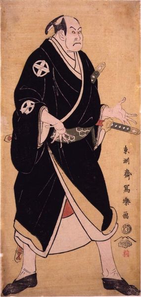 Editor: This is "Actor Ichikawa Monnosuke AS OTAKA GENGO TADAO" by Katsukawa Shun'ei. It seems to capture a very specific character. What does this figure tell us about the context of Kabuki theatre at the time? Curator: The striking makeup and exaggerated pose are characteristic of Kabuki prints, reflecting the stylized nature of the performances. These prints served as promotion, capturing the essence of popular actors and plays, and circulating images within society. Editor: So, it's a form of publicity? Curator: Precisely! Consider how the print's accessibility allowed wider audiences to engage with Kabuki. Also, note the role of the artist in shaping perceptions and reflecting cultural values. Editor: That gives me a new appreciation for the print. Thank you. Curator: A valuable lens to understand its place in society!
